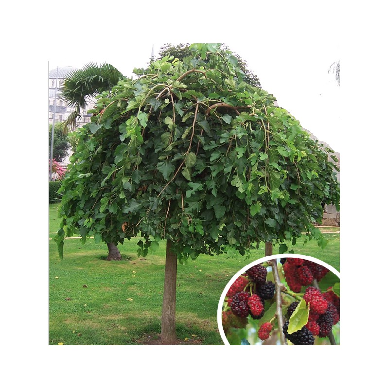 Ce murier est un arbre très original par sa forme pleureur, à croissance assez rapide, idéal pour avoir un arbre d'envergure raisonnable avec une forme très originale, adapté aux petits jardins. Il produit de petites mûres rouge foncé à maturité, elles sont comestibles. Beau feuillage doré en automne.